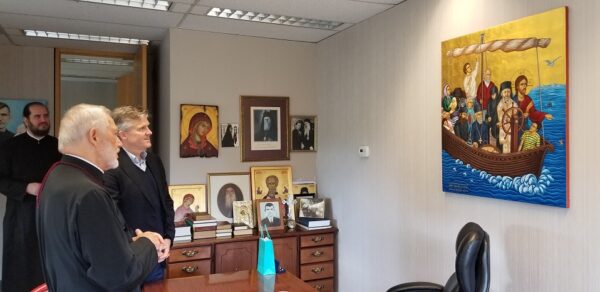 Minister Phillips first visited the Chapel of Saint John the Theologian, where His Eminence gave the Minister a brief history of the Archdiocese and also discussed the Byzantine iconography of the church. The Minister also saw the Archdiocesan Library and facilities of the Patriarchal Toronto Orthodox Theological Academy.