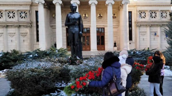 The students of the Orthodox Pedagogical High School “Anastasia Popescu” in Bucharest continued this year the tradition of placing a garland of red carnations on the shoulders of the statue of Mihai Eminescu in front of the Romanian Athenaeum to mark Romania’s National Culture Day.