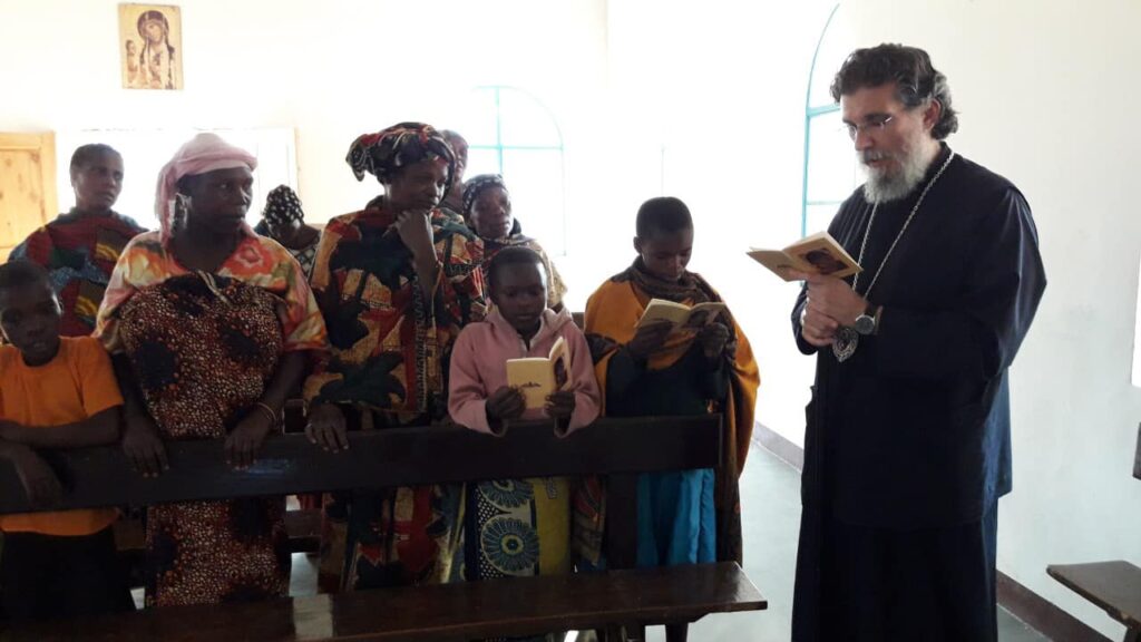 In the Arusha diocese of central Tanzania, Orthodox Bishop, His Grace Agathonikos, addresses the first prayer to the Theotokos in the village of Ibogo, where the St. John the Theologian Orthodox chapel is located.