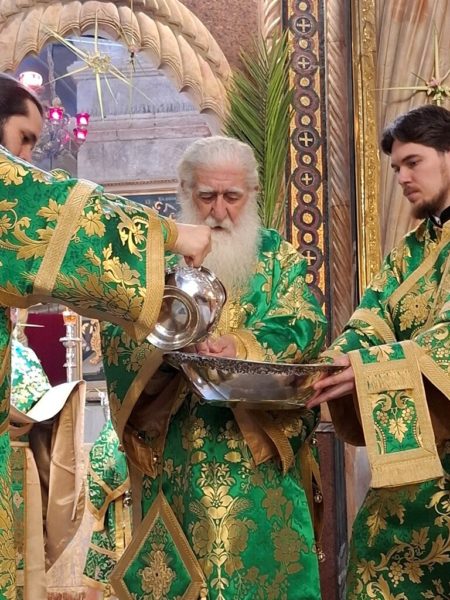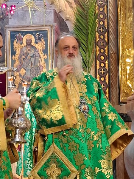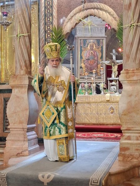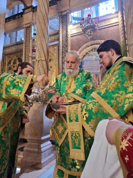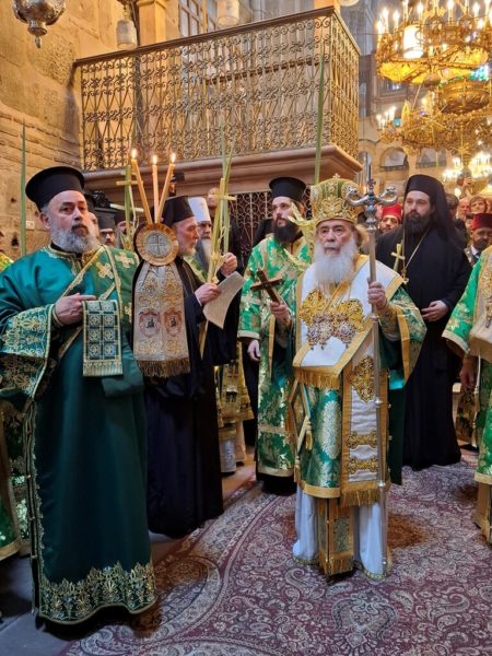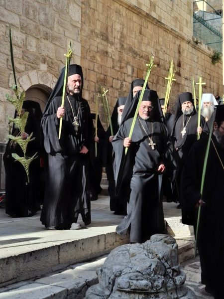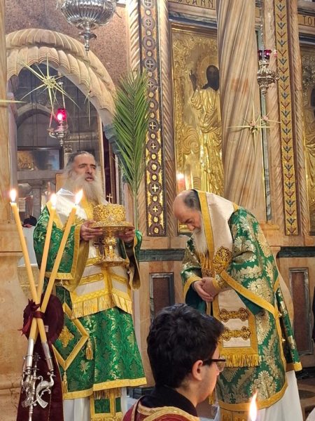 On the morning of Sunday, the Palm Sunday feast itself, the festive Divine Liturgy was celebrated in the Catholicon of the Church of the Holy Sepulchre. The Liturgy was presided over by His Beatitude, the Patriarch of Jerusalem Theophilos III, and concelebrated by Their Eminences: Metropolitan Isychios of Kapitolias; the visiting Bishop Georgiy of Nizhny Novgorod; Archbishop Theophanes of Gerash; Archbishop Dorotheos of Avila; Archbishop Aristarchos of Constantine; Archbishop Methodios of Tabor; Archbishop Theodosios of Sebastia; Archbishop Demetrios of Lydda; and Archbishop Philoumenos of Pella.
