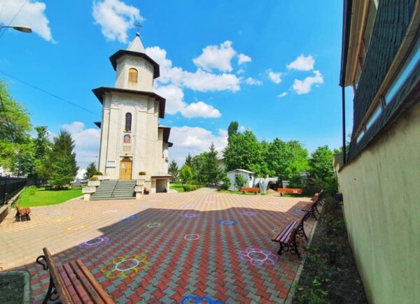 Another parish in northeastern Romania has drawn flowers with a distance of 1.5 meters between them in its courtyard to help people keep the social distancing.