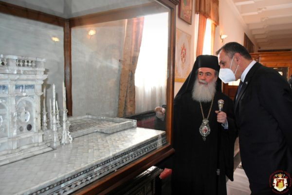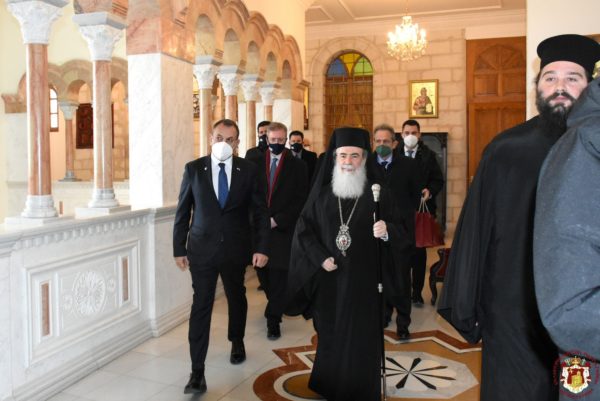 After discussions revolving around issues of common interests, the Patriarch of Jerusalem accompanied the minister on a tour of the Patriarchate’s most historic premises.