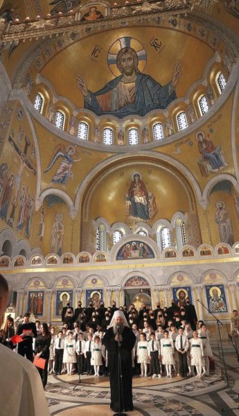 The Saint Sava gathering began with the Lord’s Prayer, which was uttered of one mouth and one heart by one thousand children along with the choirs of the Saint Sava Cathedral church. Besides His Holiness Porfirije, the Serbian Patriarch, the joyful gathering was attended by Their Graces Bishops Stefan of Remesiana, Jerotej of Toplica, Justin of Hvosno and Sava of Marca, as well as protosynchellos Danilo, Director of the Patriarchal Administrative Office, numerous priests, faithful people and children with their parents and teachers.