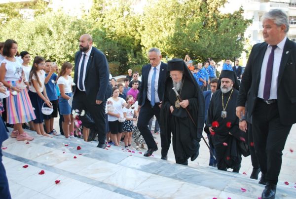 His All-Holiness was welcomed by Metropolitan Symeon of Nea Smyrni and a large crowd of faithful. The Ecumenical Patriarch is visiting Nea Smyrni for the naming of a city square and the unveiling of a monument dedicated to Imbros and Tenedos.