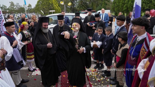Earlier, His All-Holiness received a warm and enthusiastic welcome at the Holy Cemetery Church of Saint Athanasios from the Parish Priest Fr John Grillis, and from numerous faithful, including many children who showered him with rose petals. Father John addressed the Patriarch, expressing heartfelt thanks for his blessed visit to Rookwood, while briefly presenting the history of the establishment of the Church of Saint Athanasios.
