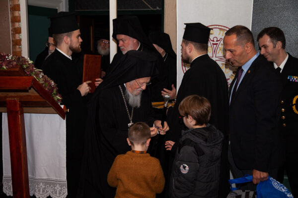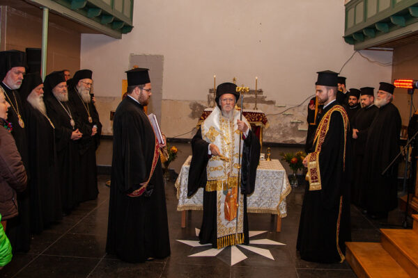 Patriarhul Ecumenic și delegația sa au fost întâmpinați în pridvorul bisericii de preotul paroh și credincioșii din Amsterdam și din împrejurimi.