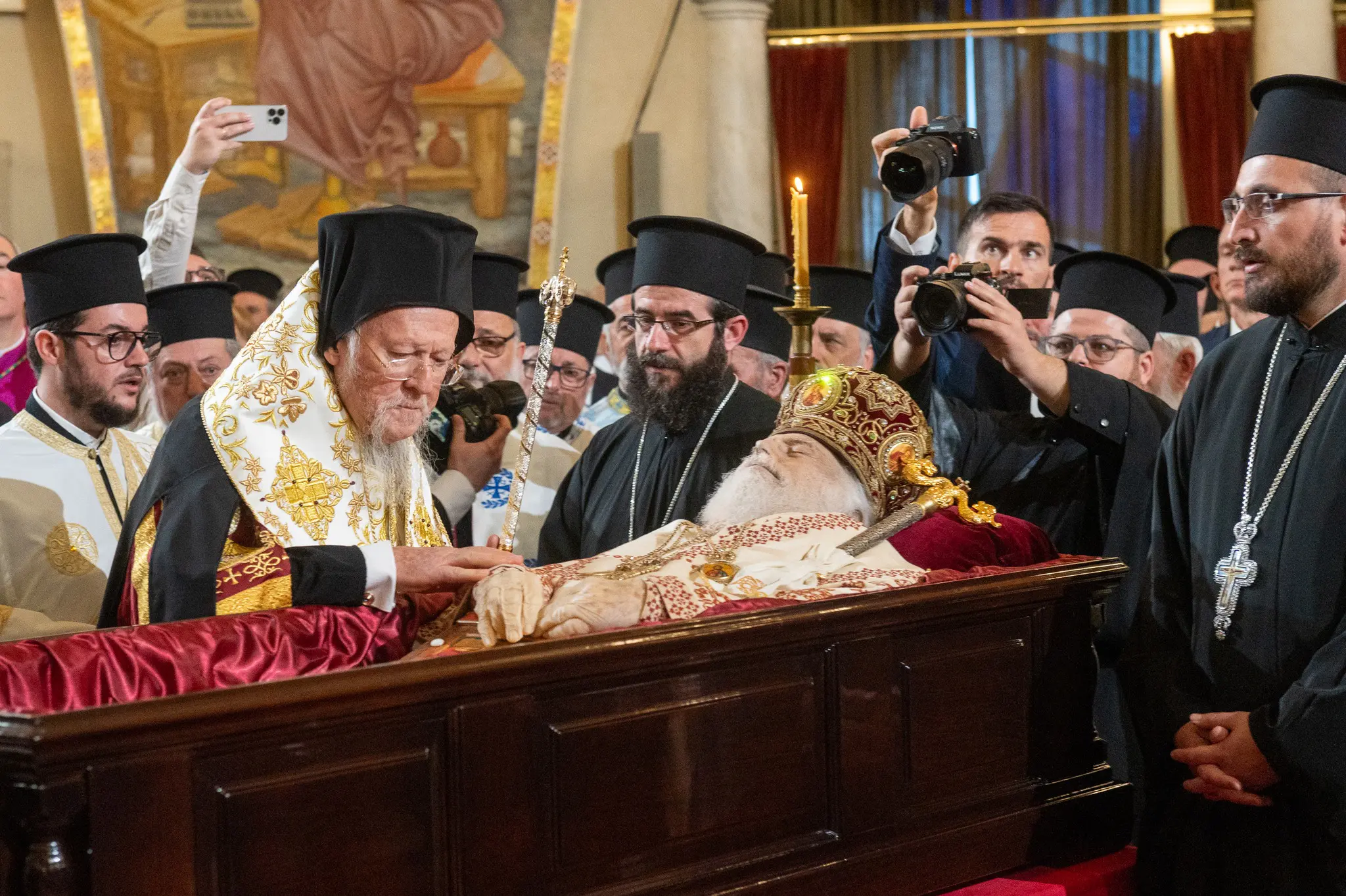 Patriarhul Ecumenic Bartolomeu I al Constantinopolului i-a adus un ultim omagiu Arhiepiscopului Anastasie al Albaniei joi, 30 ianuarie 2025. Foto: Facebook / Aleksander Wasyluk Photography