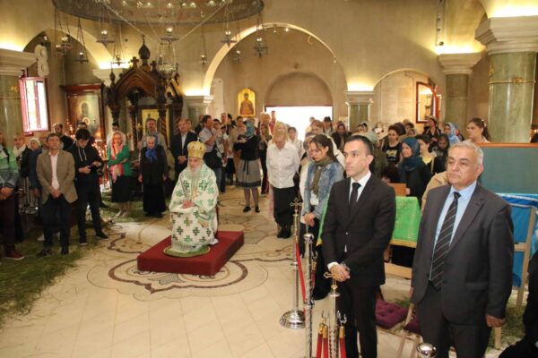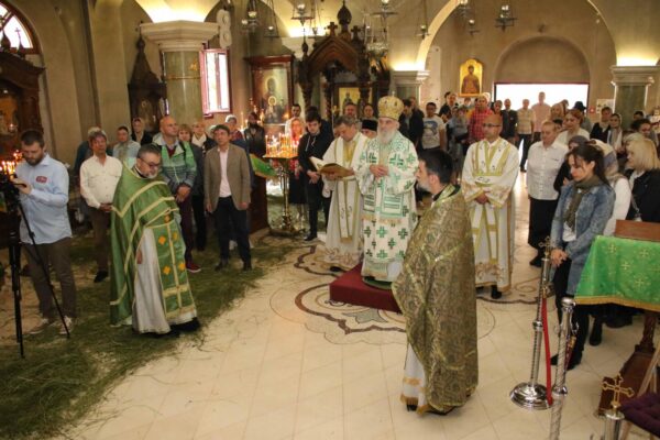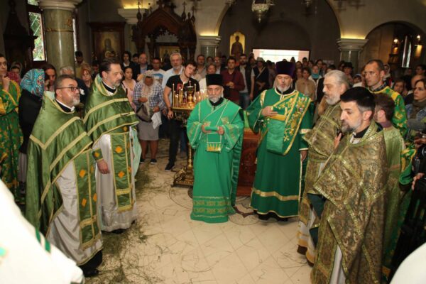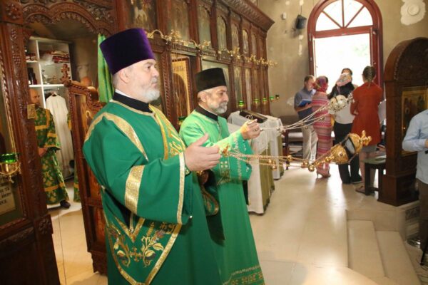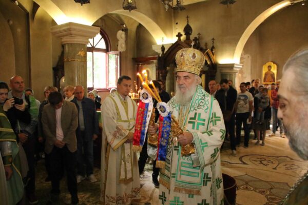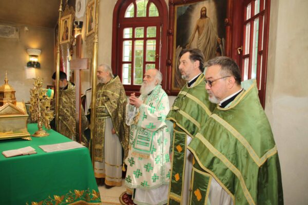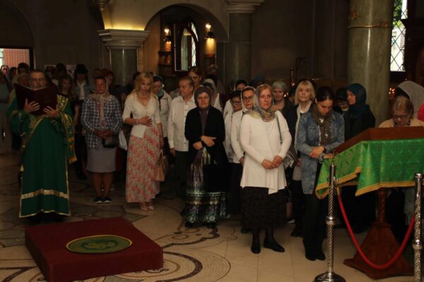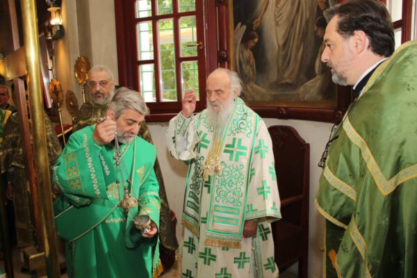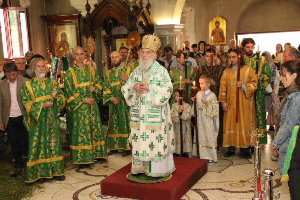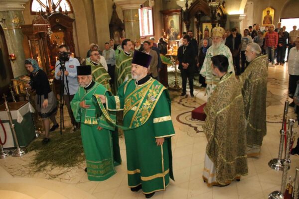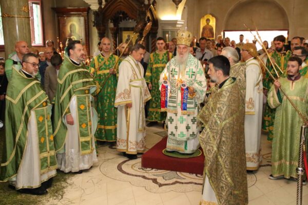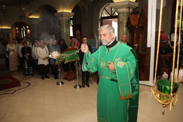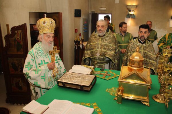 His Holiness Irinej, Serbian Patriarch, officiated the Holy Liturgy with concelebration of archpriest Vitaly Tarasyev, principal of the church of Holy Trinity, and priests of the Archbishopric of Belgrade-Karlovci: protodean Branislav Borota from the church of Saint Mark; archpriest Nebojsa Topolic, principal of the church of Holy Mother of God in Zemun; presbyter Ivan Delic from the Diocese of Banat; protodeacon Stevan Rapajic; deacon Vladimir Rumeni.