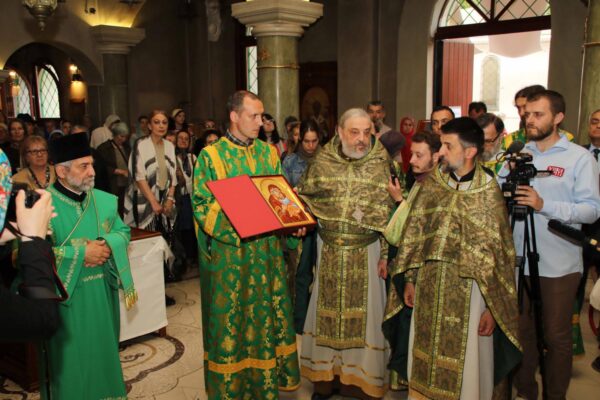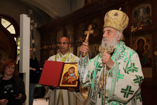 As a token of gratitude and constant support to the Representation of the Russian Orthodox Church, principal of the church, archpriest Vitaly Tarasyev, on behalf of the Church Committee and all the members of the Russian Holy Trinity Church in Belgrade, especially with the blessing of Patriarch Kirill of Moscow and All Russia, handed in to Patriarch Irenej icon of the Most Holy Mother of God of Decani.