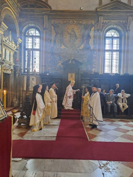 On Sunday, 16 June 2024, the Sunday of the Holy Fathers of the 1st Ecumenical Council, a Poly-Hierarchical Divine Liturgy took place at the Cathedral Church of Saint George of the Greeks in Venice, and was presided over by His Eminence Metropolitan Meliton of Philadelphia, who was joined in concelebration by His Eminence Metropolitan Polykarpos of Italy and His Grace Bishop Georgios of Krateia, on the occasion of the 450th anniversary of the completion of the historic Church of Saint George of the Greeks (San Giorgio dei Greci)