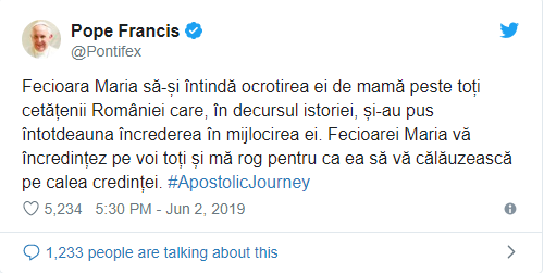 Primul tweet marcat cu hashtagul #Romania pe contul papei Francisc se referă la Duhul Sfânt, care „iubește formarea unității din cea mai frumoasă și armonioasă diversitate”.