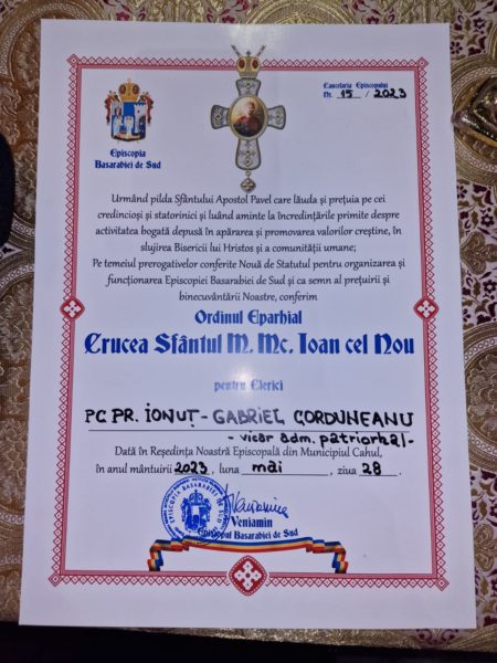 Preotul Ionuț Corduneanu, distins de Episcopia Basarabiei de Sud cu Ordinul „Crucea Sf. M. Mc. Ioan cel Nou”