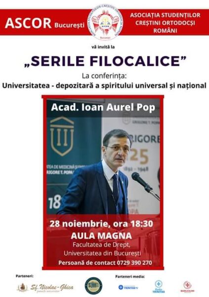 Academicianul Ioan Aurel Pop, Președintele Academiei Române, va conferenția la finalul acestei luni în cadrul Serilor Filocalice organizate de Asociația Studenților Ortodocși (ASCOR) București.