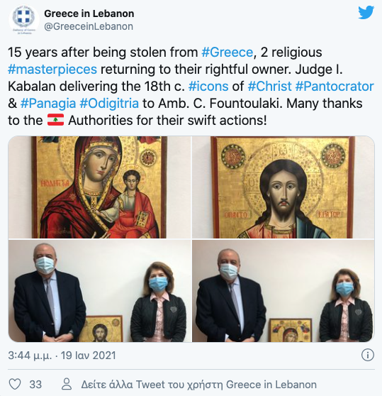 Lebanese authorities on Tuesday returned two stolen 18th-century icons – of Christ the Almighty and the Virgin Mary, as the Panaghia the Hodegetria or Directress – to the Greek ambassador in the country.