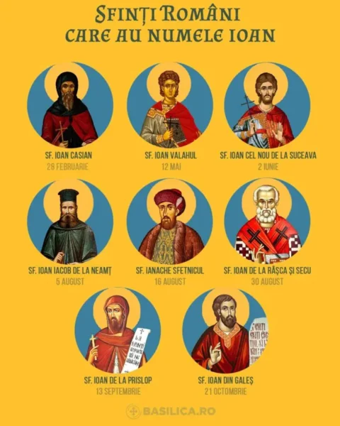 În calendarul Bisericii Ortodoxe Române sunt înscriși opt sfinți români care au numele Ioan. Aceștia sunt: Sfântul Ioan Casian, Sfântul Ioan Valahul, Sfântul Ioan cel Nou de la Suceava, Sfântul Ioan Iacob de la Neamț, Sfântul Ianache Sfetnicul, Sfântul Ioan de la Râșca și Secu, Sfântul Ioan de la Prislop și Sfântul Ioan din Galeș.