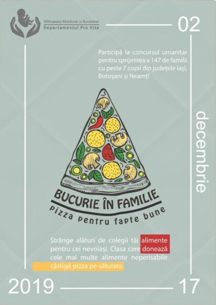 Pro Vita Iași desfășoară în perioada 2 – 17 decembrie 2019 a patra ediție a Campaniei „Bucurie în familie – pizza pentru fapte bune”.