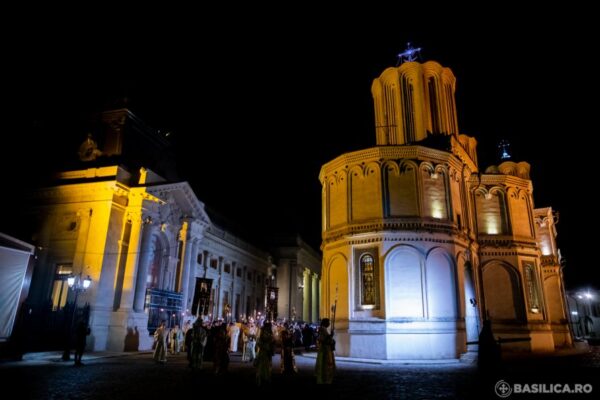 La finalul slujbei de Priveghere, soborul slujitor, în fruntea căruia s-a aflat Episcopul vicar Timotei Prahoveanul, a mers în procesiune cu moaștele Sfinților Trei Ierarhi în jurul Catedralei Patriarhale istorice.