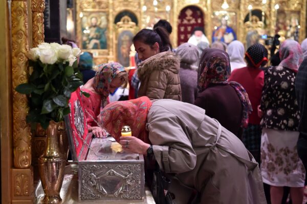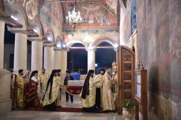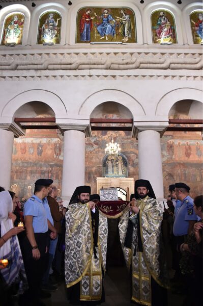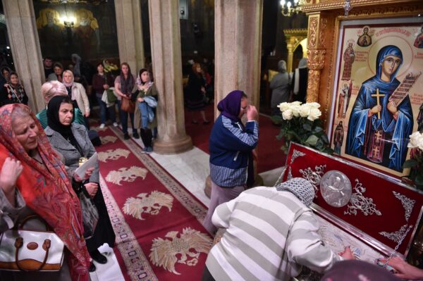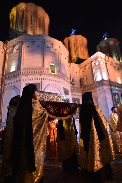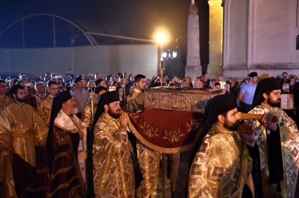 Racla în care se păstrează veşmântul sfintei a fost dusă de la Reşedinţa Patriarhală către Catedrala Patriarhală la momentul începerii Privegherii.