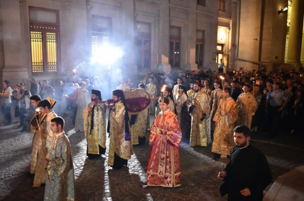 La finalul slujbei racla cu veșmântul Sfintei Parascheva a fost purtată în procesiune în jurul Catedralei Patriarhale.