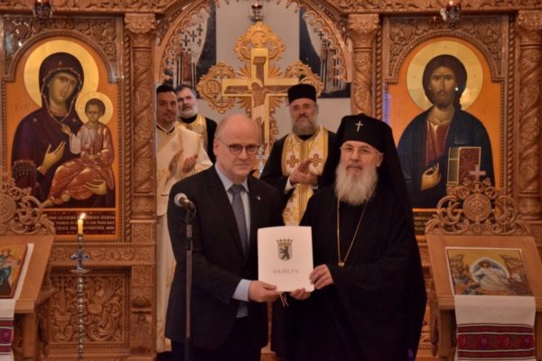 În continuare, Gerry Woop a vorbit despre drumul lung parcurs până la obținerea statutului de corporație de drept public, dar și de faptul că românii contribuie la diversitatea religioasă a landului Berlin. Oficialul a apreciat deschiderea Mitropoliei româneşti spre dialog interconfesional, pentru susținerea păcii și a înțelegerii între popoare, cât și implicarea acesteia în sprijinirea celor care au nevoie de ajutor. De asemenea, ambasadorul Adriana Stănescu a subliniat importanța momentului pentru relațiile româno‑germane, arătând că Biserica joacă un rol foarte important în menținerea unității comunității românești și păstrarea identității și limbii acesteia.