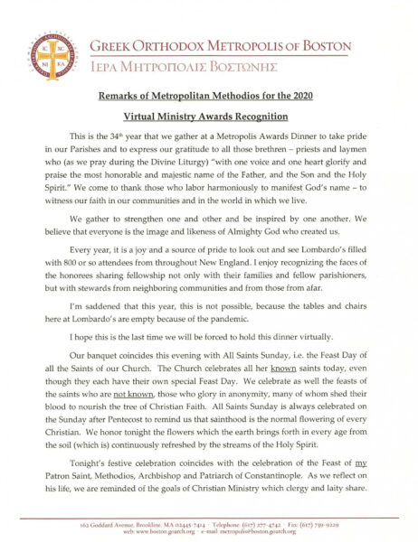 Remarks of Metropolitan Methodios for the 2020 Virtual Ministry Awards Recognition
