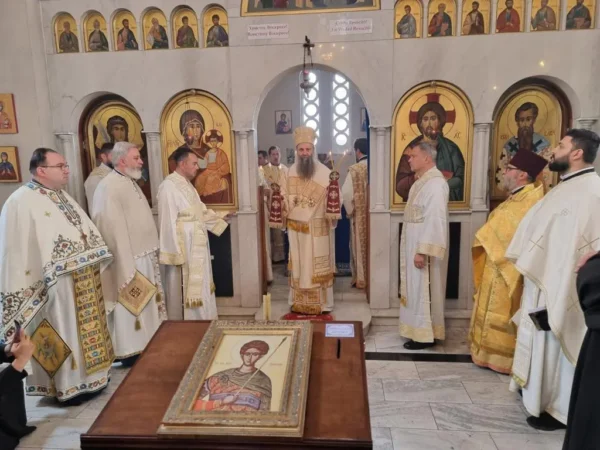 Cu acest prilej, Părintele Daniel Ene i-a dăruit Patriarhului Bisericii Ortodoxe Sârbe, din partea Mitropolitului Ortodox Român al celor două Americi, icoana Anului omagial al pastorației românilor din diaspora 2021.