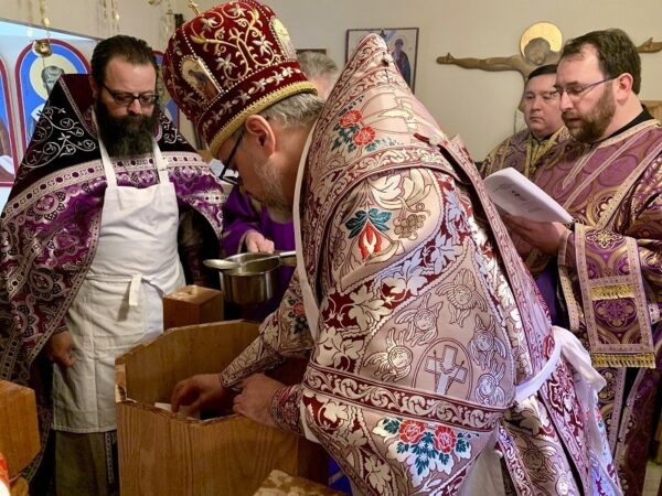 Following the arrival to Los Alamos, NM Archbishop Daniel presided over the celebration of the Vespers service, which was prayerfully served by Fr. Theophan and the chanters of the parish’s choir. Welcoming the hierarch, Fr. Theophan emotionally spoke about the long-awaited moment when the sacred relics would be installed in the altar of the parish. Responding to the words of welcome, His Eminence Archbishop Daniel reflected about the notion of the time of spiritual and patient expectation moment, which early on Akathist Saturday morning led to the consecration of the “very heart” of the church community.