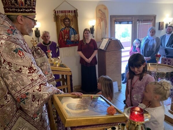 Following the conclusion of the Divine Liturgy, the pastor of the congregation – Fr. Theophan Mackey expressed his gratitude to the bishop for his spiritual care and love towards the flock of the Venerable Job of Pochaiv church. The entire parish congregation presented His Eminence with the hand-written icon of the Birth-Giver of God, as a spiritual gift that shall remind the hierarch of the consecration of the temple and the sacred Altar.