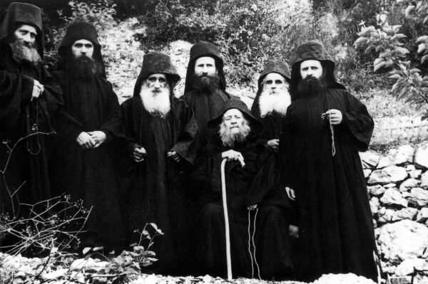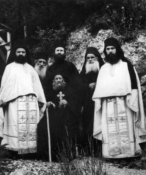 The brotherhoot at New Skete: From left to right: father Athanasios, father Ephraim of Arizona, father Arsenios, father Joseph of Vatopedi, Saint Joseph the Hesychast (with the cane), father Theophylactos, father Charalampos