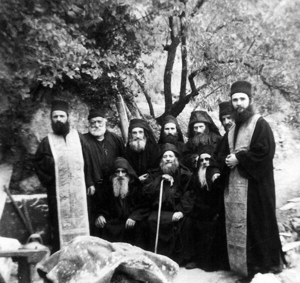 The brotherhoot at New Skete: From left to right: father Charalampos, Barbayannis, father Arsenios (down), father Eustathios, Saint Joseph the Hesychast (with the cane), father Joseph of Vatopedi, father Athanasios, father Theophylactos (down), father Nikodimos, father Ephraim of Arizona