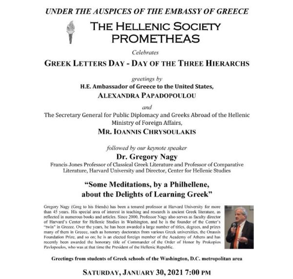 01/02/2021 01/02/2021 The Hellenic Society Prometheas  hosted online celebration of Greek Letters Day, under the auspices of the Embassy of Greece. The celebration  began with greetings by H.E. Ambassador of Greece to the United States, Alexandra Papadopoulou, and the Secretary General for Public Diplomacy and Greeks Abroad of the Hellenic Ministry of Foreign Affairs, Ioannis Chrysoulakis. Our...