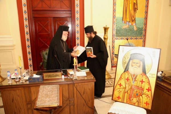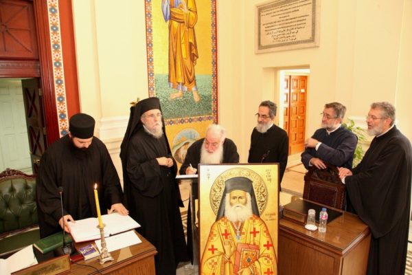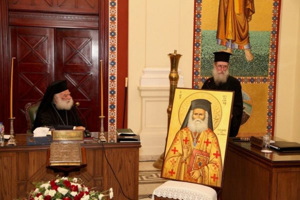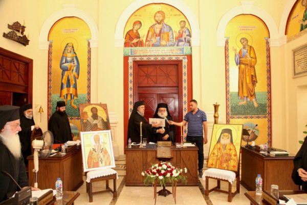 Thereafter took place the official canonization into the hagiological registers of the Church of Our Holy Father Sylvester, Pope and Patriarch of Alexandria, and of Our Venerable and God-bearing Father Chrysostomos, the Missionary of Africa (Papasarantopoulos). Following the reading of the Patriarchal and Synodal Acts, His Beatitude presented to the Hierarchs the holy icons and liturgical services (composed by His Eminence Cyril, Metropolitan of Rhodes) of the new Saints and exhorted all to invoke their intercessions at every moment of their ministry in Africa.