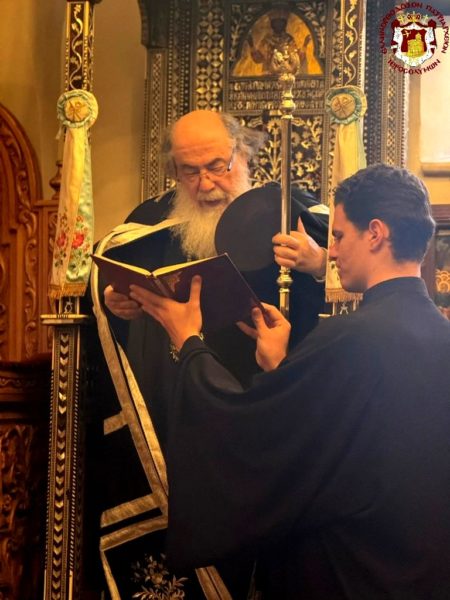 - At the Patriarchal and Monastic Church of Saints Constantine and Helen, with His Beatitude our Father and Patriarch of Jerusalem, Theophilos III, presiding, and with the Hierarchs and other Fathers of the Holy Sepulchre Brotherhood in prayer, together with the students of the Patriarchal School of Zion and pilgrims. The chanting was led by the chief cantor of the Church of the Holy Sepulchre, Deacon Efstathios, along with the students of the School.
