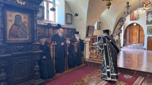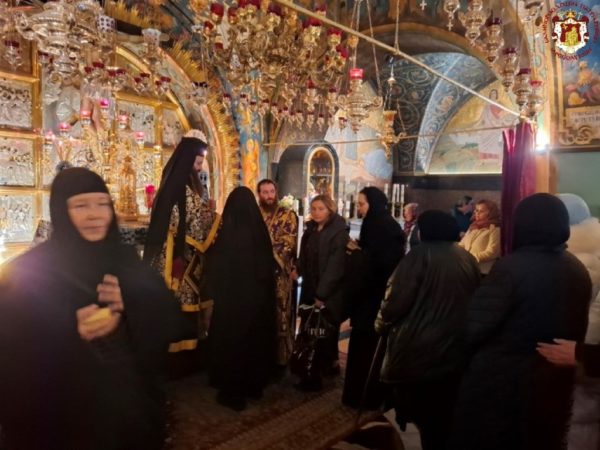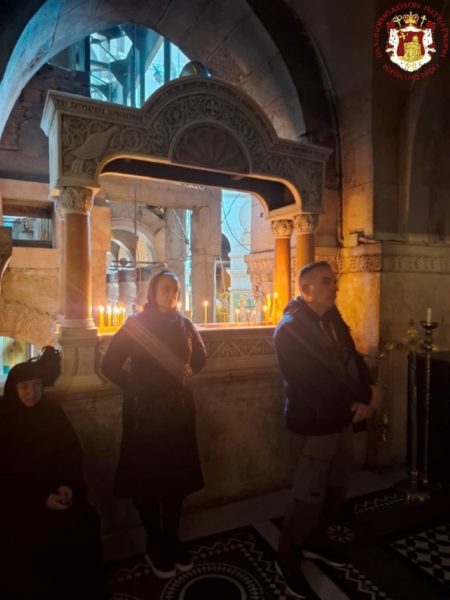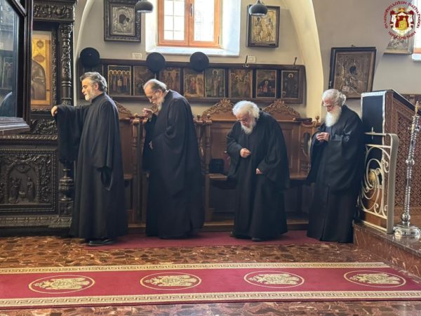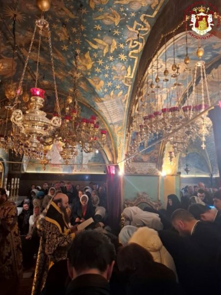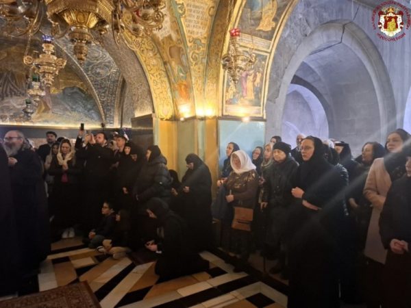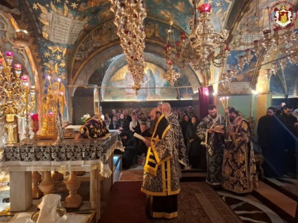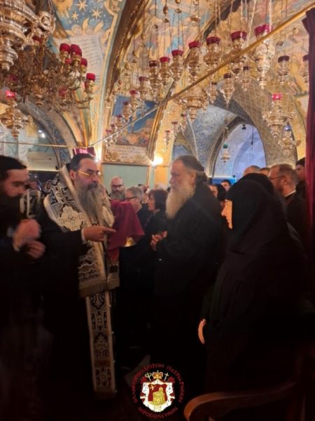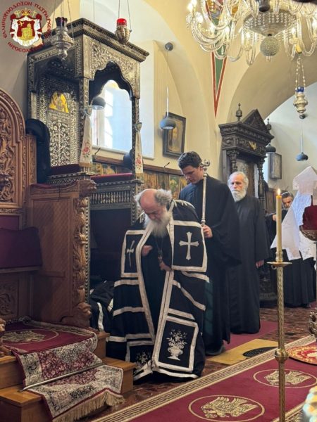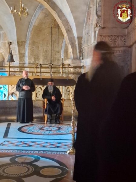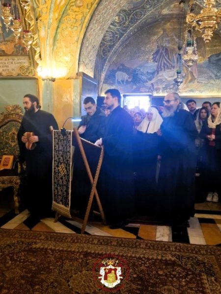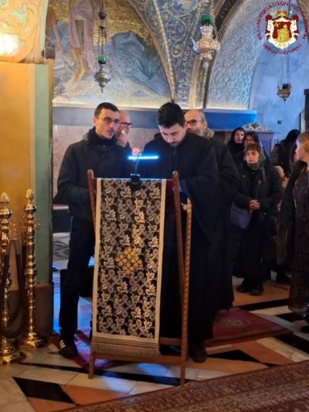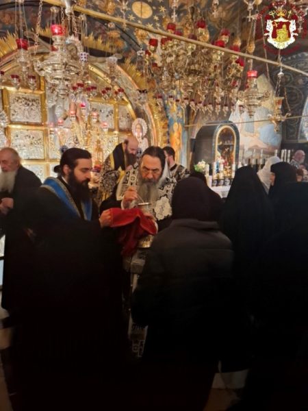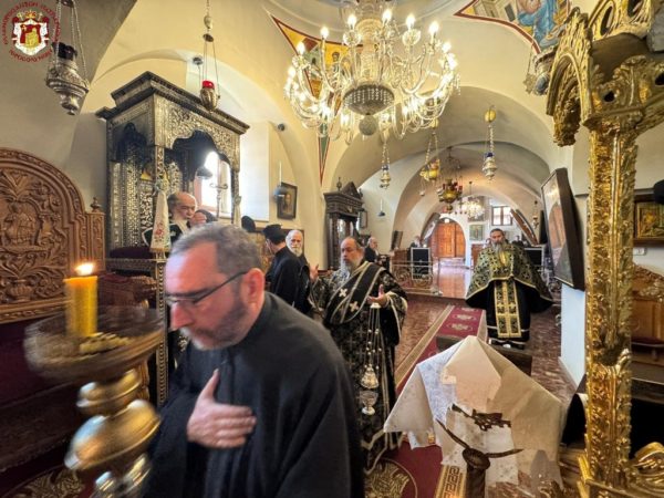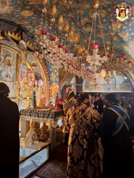 - At the Patriarchal and Monastic Church of Saints Constantine and Helen, with His Beatitude our Father and Patriarch of Jerusalem, Theophilos III, presiding, and with the Hierarchs and other Fathers of the Holy Sepulchre Brotherhood in prayer, together with the students of the Patriarchal School of Zion and pilgrims. The chanting was led by the chief cantor of the Church of the Holy Sepulchre, Deacon Efstathios, along with the students of the School.