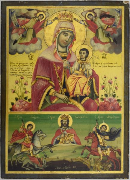 Në pjesën e poshtme paraqiten tre shenjtorë në pamje ballore. Duke nisur nga e majta në të djathtë paraqiten me rradhë Shën Gjergji, i cili paraqitet mbi kalin e bardhë duke vrarë dragoin. Pas tij vjen Shën Konstandini me kuroren mbretërore në kokë dhe në duar mban ungjillin e shenjtë si dhe skeptrin mbretëror. Ai paraqitet i veshur me veshjen ceremoniale.