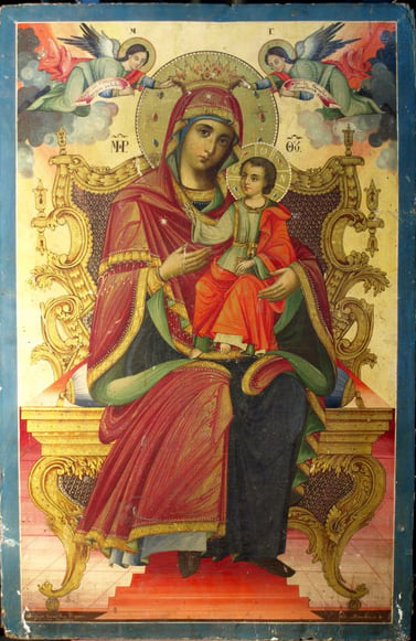 Ikona “Shën Mëria në fron me Krishtin” është pikturuar gjatë fundit të shekullit të XIX, për të zbukuruar kishën e fshatit Sinicë në Korçë.