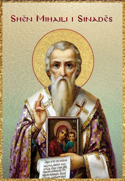Ishte nga Sinadha e Frigjisë, braktisi atdheun për të shkuar në Konstandinopojë, ku lidhi aq shumë miqësi shpirtërore me shën Theofilaktin, saqë i shikonin si një njeri të vetëm. Të dy miqtë u bënë murgj në manastirin që ndodhej në Bosfor. Përparuan shpejt në virtyt, përulësi dhe në gëzim të përhershëm të shpirtit. Shën Terezi që kishte themeluar këtë manastir, duke parë arritjet e tyre, i dorëzoi peshkopë: Theofilaktin, mitropolit të Nikomedisë dhe Mihailin, peshkop të Sinadhës (rreth 784). Ai shpallte drejt fjalën e së vërtetës si me mësimet e tij, ashtu edhe me jetën. Ishte i butë, i duruar, i mëshirshëm, nuk zemërohej, drejtonte kisha e manastire dhe themeloi shtëpi pritjeje e bamirësie. Mori pjesë në Sinodin e shtatë të Nikeas (787), ku mbështeti doktrinën orthodhokse për nderimin e ikonave të shenjta.
