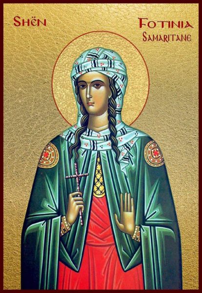 Shën Fotinia ishte gruaja nga Samaria, me të cilën Zoti ynë Jisu Krisht foli te pusi i Jakovit (Joan 4) dhe i zbuloi gjithçka që kishte bërë ajo që nga fëmijëria. Pasi ndryshoi mënyrën e jetesës, ajo shkoi për të shpallur Lajmin e Mirë në vendlindjen e saj dhe konvertoi në Krishterim katër motrat dhe dy bijtë e saj.