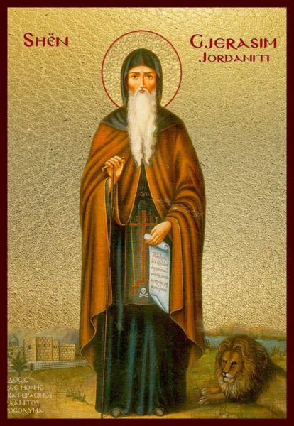 Ati ynë oshënar Gjerasimi lindi në provincën e Likisë, në fund të shekullit të 4-t, dhe që i vogël hyri në një manastir. Si mësoi rregullat e jetës së përbashkët, dëshira e zjarrtë e Perëndisë e drejtoi në vende të shkreta, ku ushqehej me bimët që mbinin atje natyrshëm. Ditë-natë luftonte kundër frymëve të errësirës dhe pasioneve të mishit. Nga aty shkoi në Tokën e Shenjtë, që të ndërmerrte beteja edhe më të mëdha në vendet e shenjtëruara nga prania e shumë asketëve dhe e apostujve të rinj. Si nderoi Vendet e Shenjta në Jerusalem, shkoi në shkretëtirën e afërt të Detit të Vdekur, të cilën e bëri si qytet, ngaqë virtytet e tij tërhiqnin një numër të madh dishepujsh.