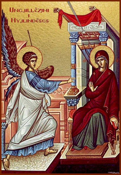 Gjashtë muaj pas ngjizjes së mrekullueshme të atij që duhet të ishte në çdo gjë Pararendësi i Shpëtimtarit (Lluk. 1:17), Gabrieli, Kryeengjëlli i mëshirës (8 nëntor), u dërgua nga Zoti në Nazaret të Galilesë, pranë Virgjëreshës Mari, e cila pasi doli nga Tempulli, ishte fejuar me të drejtin dhe me të pastrin Josif, që të ishte kujdestar i virgjërisë së saj. Duke ardhur në shtëpi papritur, me pamje njeriu dhe me një shkop në dorë, engjëlli e përshëndeti Hyjlindësen, e cila do të bëhej ngushëllimi i lotëve të Evës, duke thënë: “Gëzohu, o Hirplote, Zoti është me ty!” (Lluk. 1:28).
