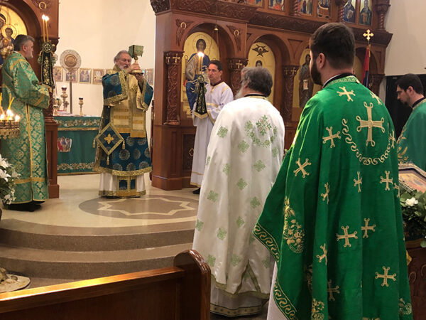 His Grace Bishop Irinej gave an inspiring sermon the topic of the Holy Spirit as the Giver of Life and the Breath of Life. He stated that the word used in Hebrew for breath, when God breathes life into Adam in Genesis, is also the same word for the Holy Spirt. The sermon emphasized that the Holy Spirt cannot be seen but much like the wind the Holy Spirit can be seen by the visible effects of Its action.