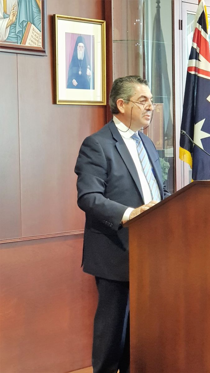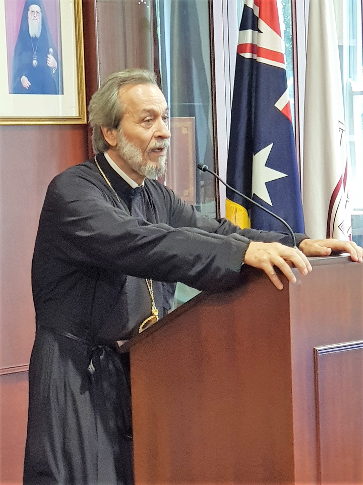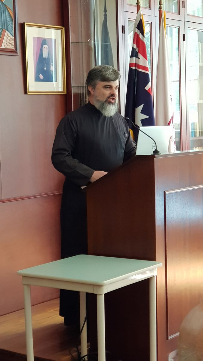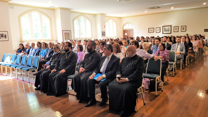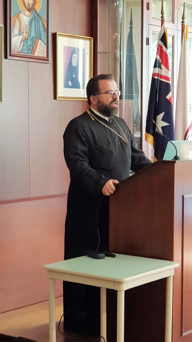 In front of an audience of around 200 people, the event was opened by the College’s Sub-Dean, His Grace Bishop Seraphim of Apollonias. It featured presentations by the Very Revd Fr Apostolos Trifyllis and the Revd Fr Anastasios Bozikis, members of the College Faculty Board, as well Mr Nicholas Augoustinos from the Sydney School of Law of the University of Notre Dame Australia. This year’s theme related to the life and work of the Three Hierarchs, Sts Basil the Great, Gregory the Theologian and John Chrysostom, who are esteemed as patrons of education in the Orthodox Tradition.