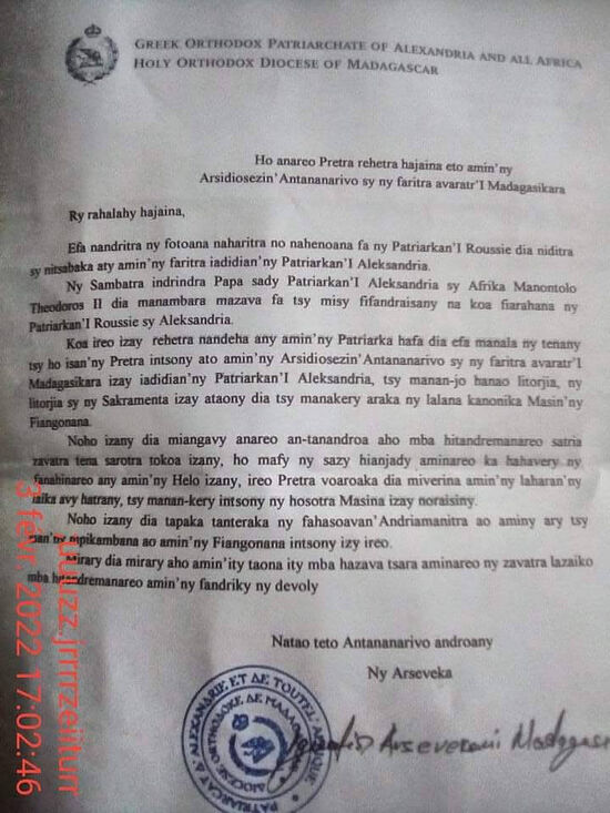 Stern warning to Madagascar priests: “Those who join Russian Orthodox Church’s African Exarchate are out of the church and in danger of hell”