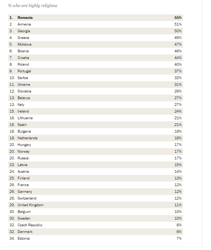 Astfel, la polul opus se află Estonia, Danemarca, Cehia, unde sub 10% din cei chestionați au declarat că sunt „foarte religioși”.