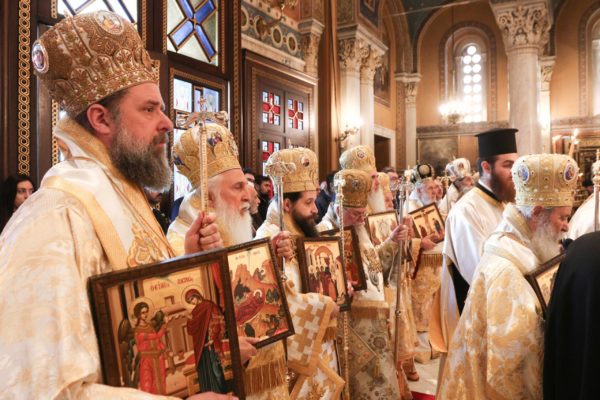 His Beatitude Archbishop Ieronymos of Athens and All Greece presided over the Divine Liturgy, and was joined by Their Eminences, Metropolitan Dorotheos of Syros, Metropolitan David of Grevena, Metropolitan Stephanos of Philippi, Metropolitan Philotheos of Thessaloniki, Metropolitan Athanasios of Siatista, Metropolitan Ierotheos of Limnos, Metropolitan Ioustinos of Nea Krini,Metropolitan Daniel of Kaisariani, Metropolitan Ephraim of Hydra, Metropolitan Seraphim of Piraeus, and Metropolitan Ignatios of Demetrias.