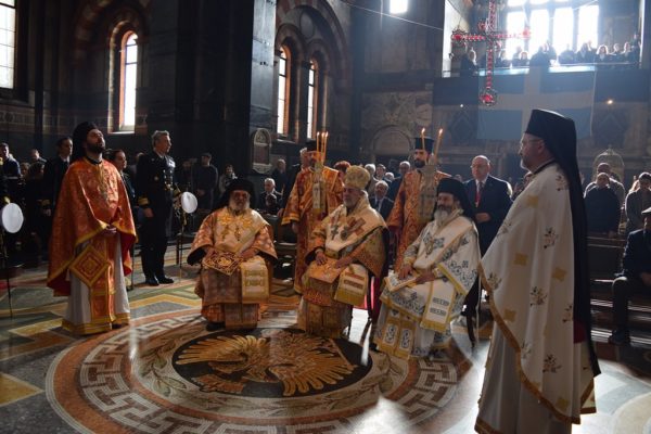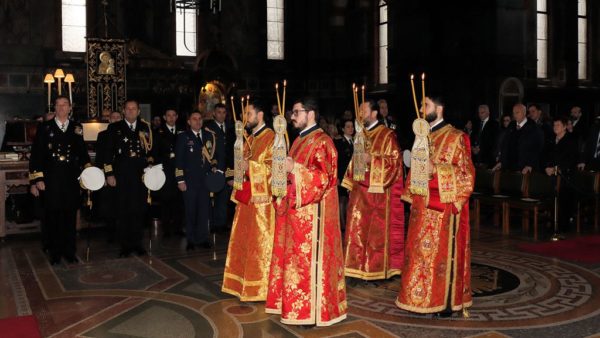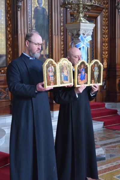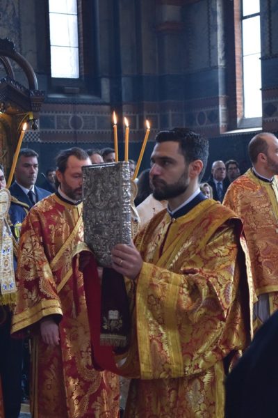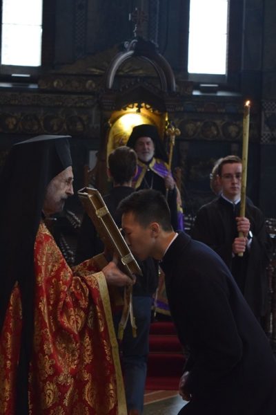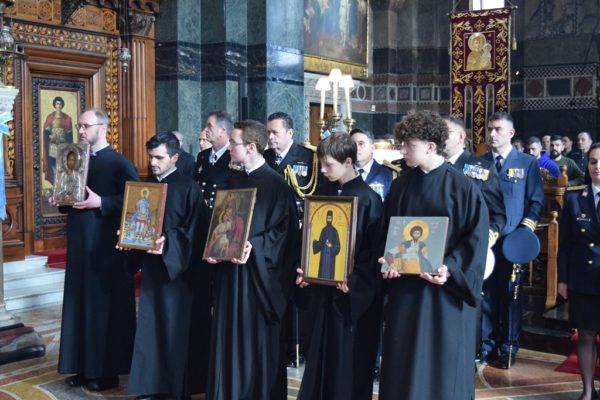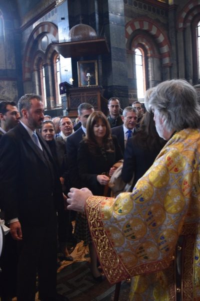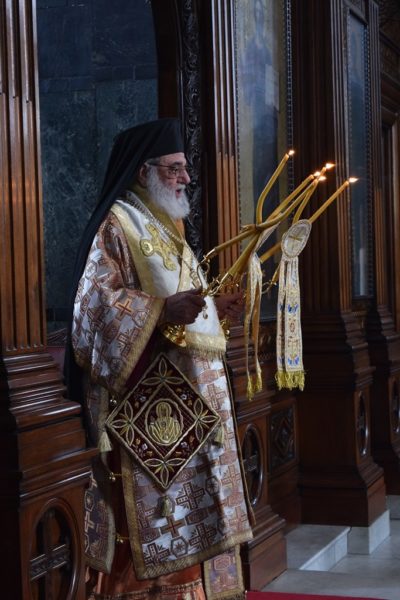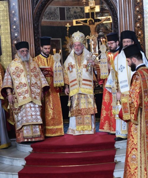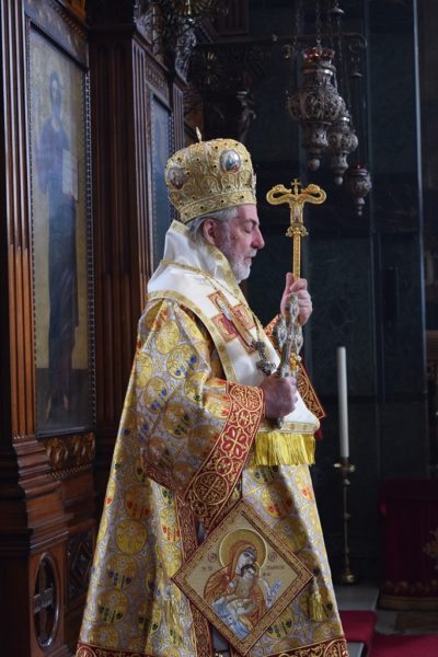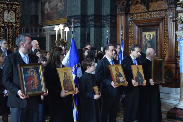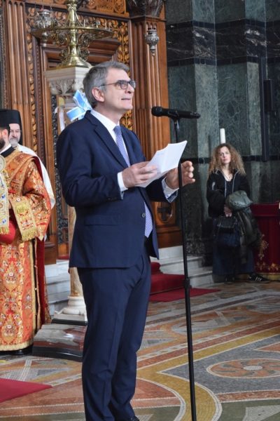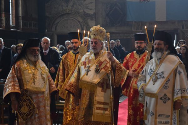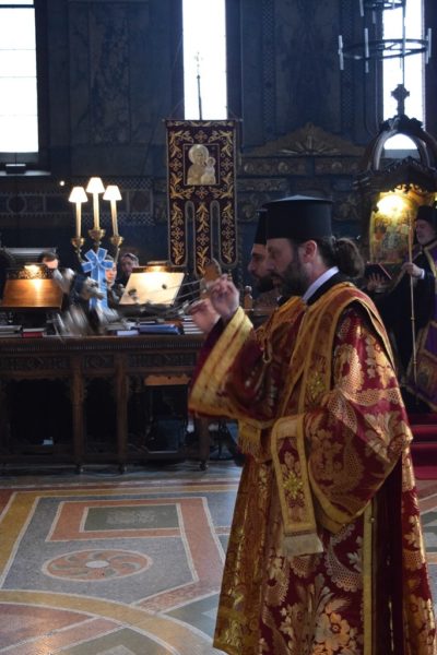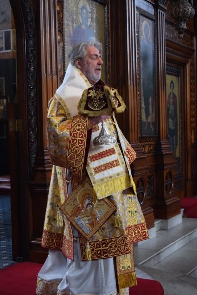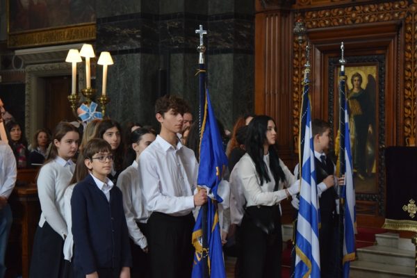 Also attending the Divine Liturgy were His Excellency Yannis Tsaousis, Ambassador of the Hellenic Republic, and His Excellency Andreas Kakouris, High Commissioner of the Republic of Cyprus, together with members of their diplomatic corps, and military attachés. Present as well were a number of Archons of the Ecumenical Patriarchate. Since the following day was the 25th of March, students from St Sophia’s School stood with Greek flags in anticipation of Greek Independence Day.
