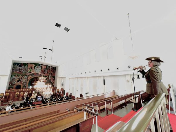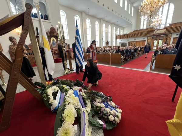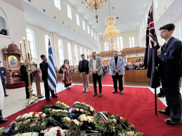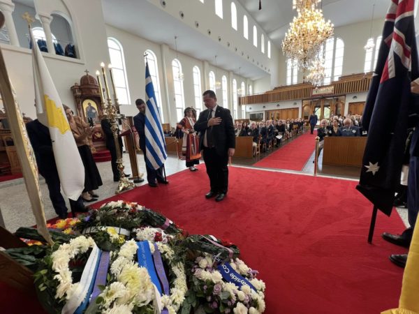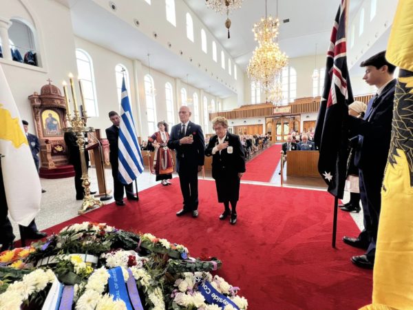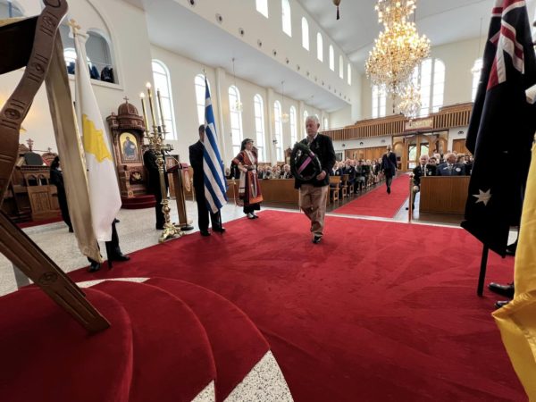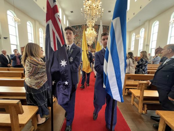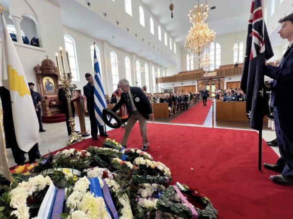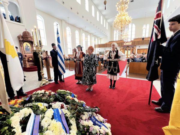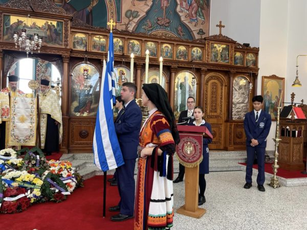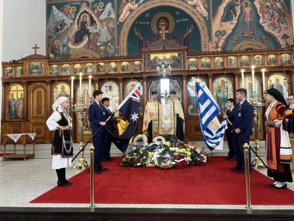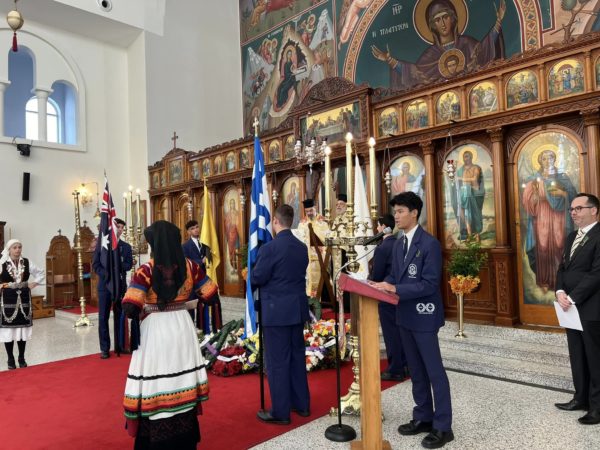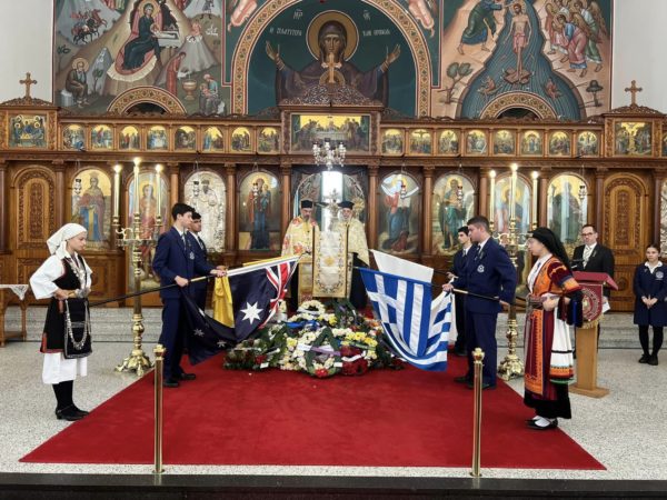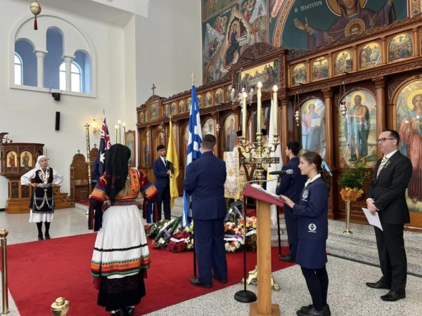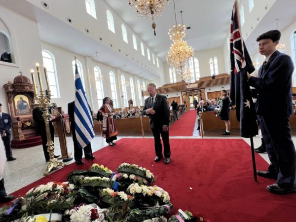St Spyridon College students impeccably carried the role of flag bearers and recited the Ode in both English and Greek, while wreaths were laid, in front of the Royal Doors of the Altar, by representatives of the Local Government, by the Consul General of Greece in Sydney, Mr. Yannis Mallikourtis, by the president of the Parish of Saint Spyridon, Mr. Elia Economou, as well as by Veterans of the RSL Association, by officers of the Australian Army and by representatives of other agencies and associations.