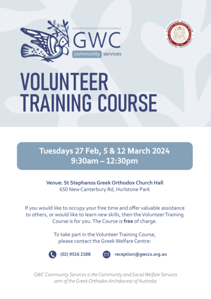 The Greek Welfare Centre of the Holy Archdiocese of Australia is organising a Volunteer Training Course for those who wish to engage in community service or acquire new knowledge and skills.