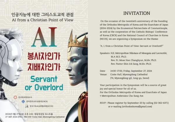 The Orthodox Metropolis of Korea (H.E. Metropolitan Ambrosios Cho Sung-am), together with the Catholic Bishops’ Conference of Korea (CBCK, Presiding H.E. Metropolitan Matthias Rl long-hoon) and the National Council of Churches in Korea (NCCK, President Rev. Pastor Yoon Chang-seop, General Secretary Rev. Pastor Kim Jong Seng), will hold a symposium ON THE THEME: “AI from a Christian Point of View: Servant or Overlord?” on 27 September in Seoul.