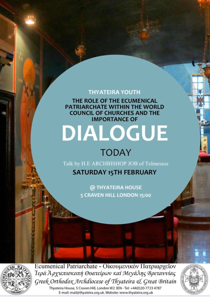 A talk on “the role of the Ecumenical Patriarchate within the World Council of Churches and the importance of dialogue today” will be held by Thyateira Youth of the Archdiocese of Thyateira and Great Britain, on Saturday, February 15.
